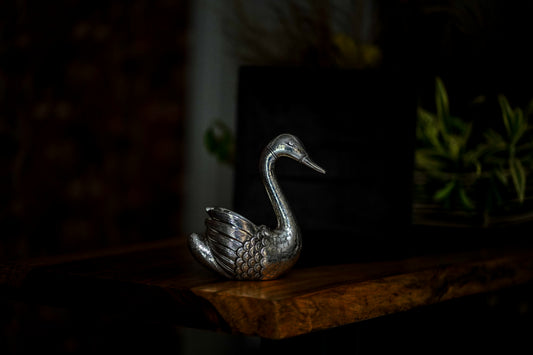 Discover the beauty of our decorative swan figurines and elegant peacock swan sculptures, expertly designed to add a touch of sophistication to your home. Our unique silver swan ornaments serve as a testament to exquisite craftsmanship and attention to detail. Riyaash Chaandi takes pride in offering exclusive metallic swan displays and peacock swan sculptures, making them ideal choices for those who appreciate fine art and home décor.